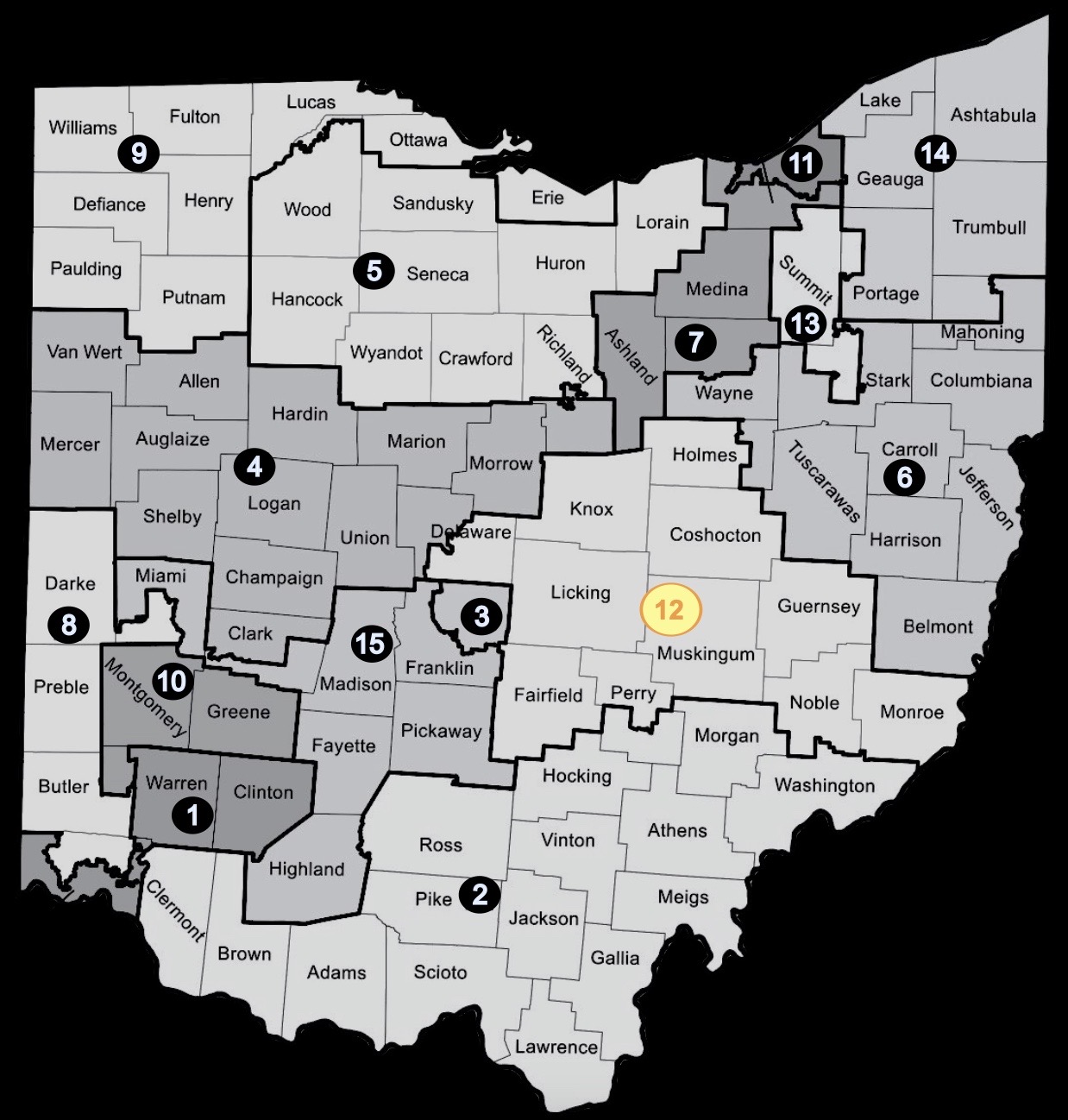 Ohio's 12th congressional district includes the following counties: Knox, Holmes, Coshocton, Guernsey, Monroe, Noble, Muskingum, Perry, Fairfield, Licking, and an eastern portion of Delaware.